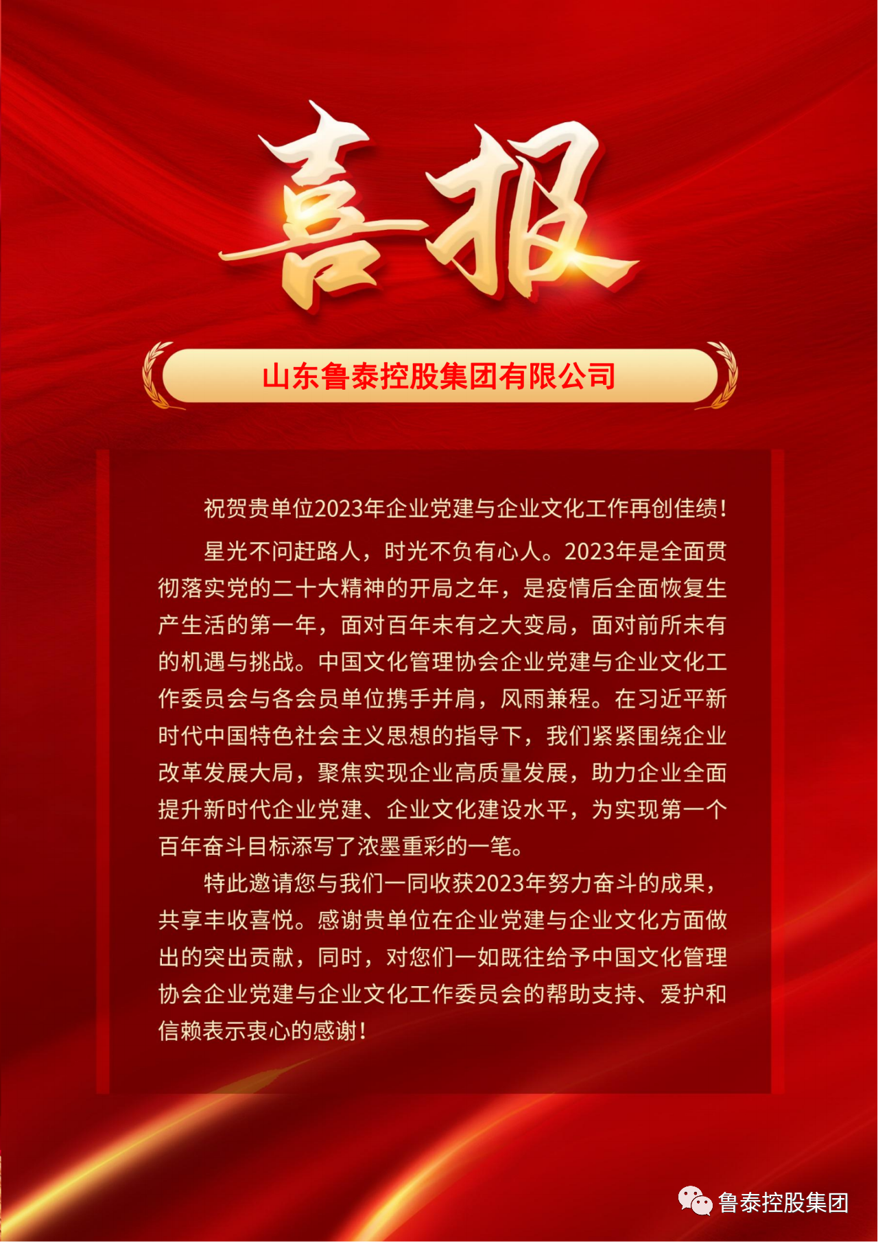 集团公司收到中国文化管理协会喜报